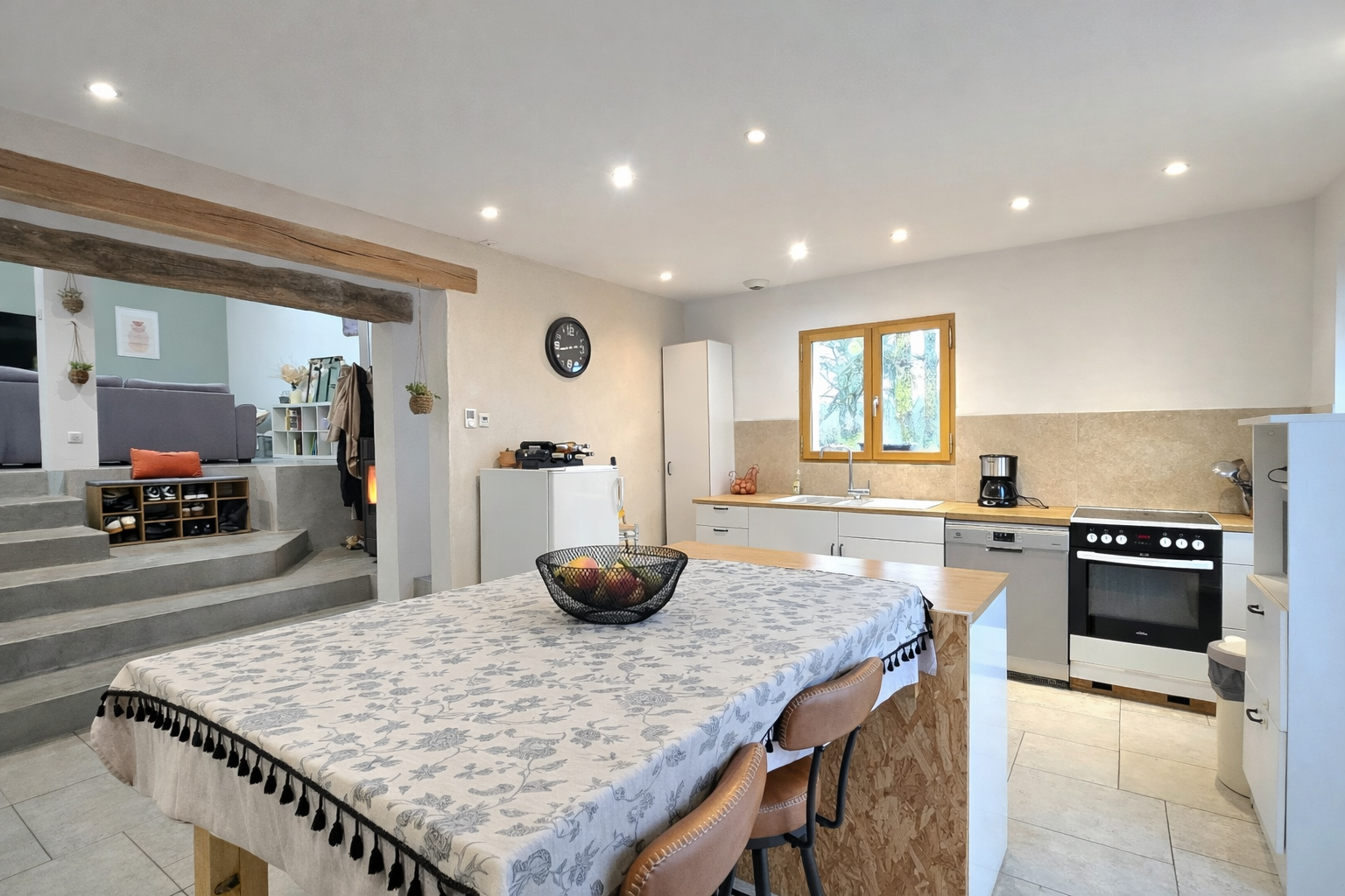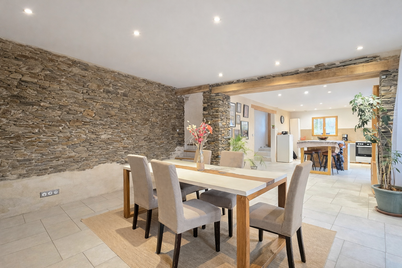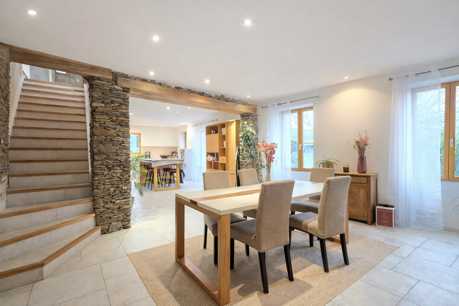 Dès l’entrée, le coup de cœur est immédiat grâce à une pièce de vie exceptionnelle de près de 90 m2, véritable signature de la maison avec ses murs en pierre. Elle se compose d’une cuisine ouverte sur un vaste espace salle à manger, puis se prolonge par un séjour aménagé dans une ancienne cave entièrement rénovée. L’ensemble est agrémenté d’un poêle à granulés, idéal pour des soirées conviviales. Les matériaux de qualité et le double escalier apportent une identité unique à cette pièce de vie aux volumes rares. Toujours au rez-de-chaussée, vous trouverez en espace bureau et un W.C