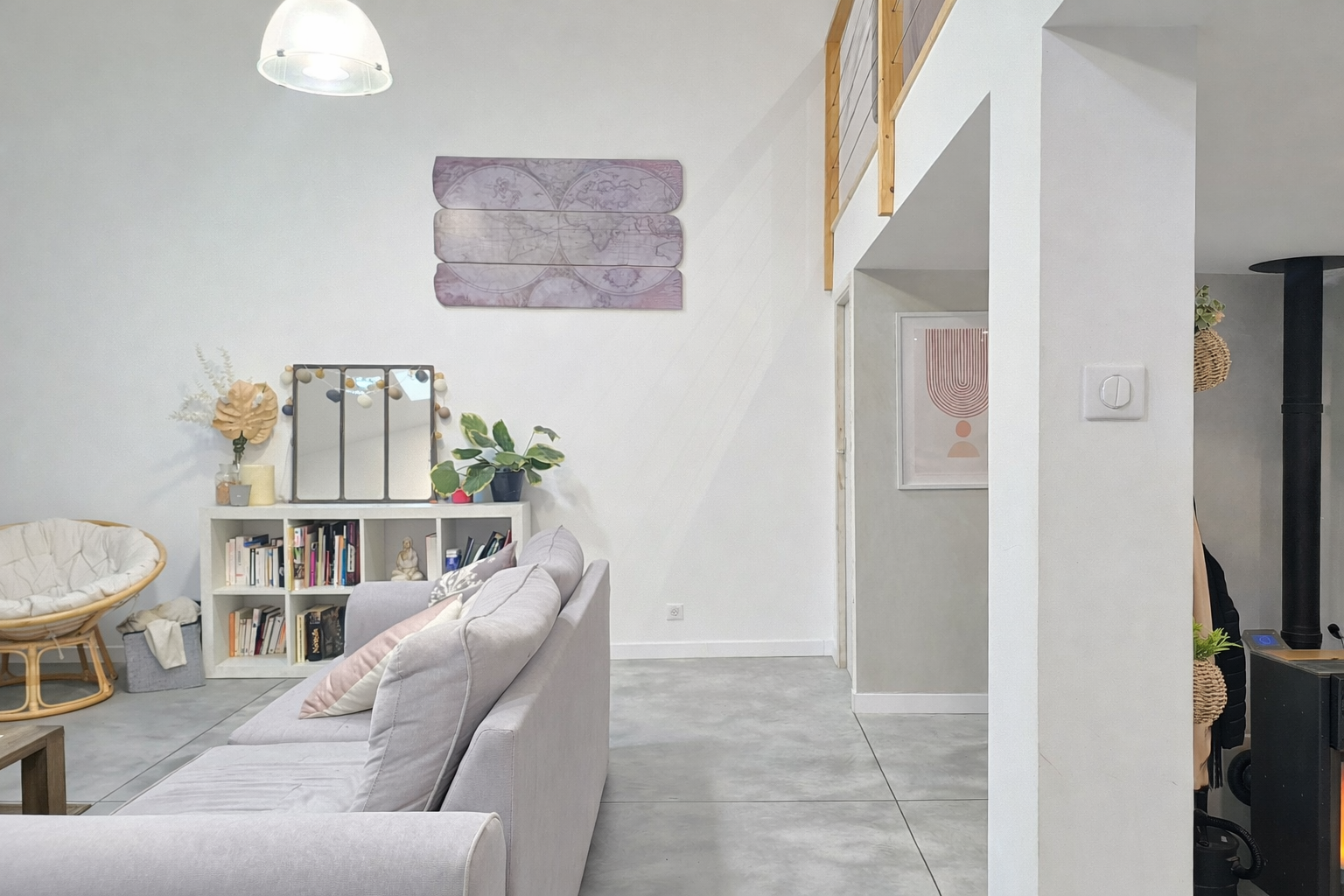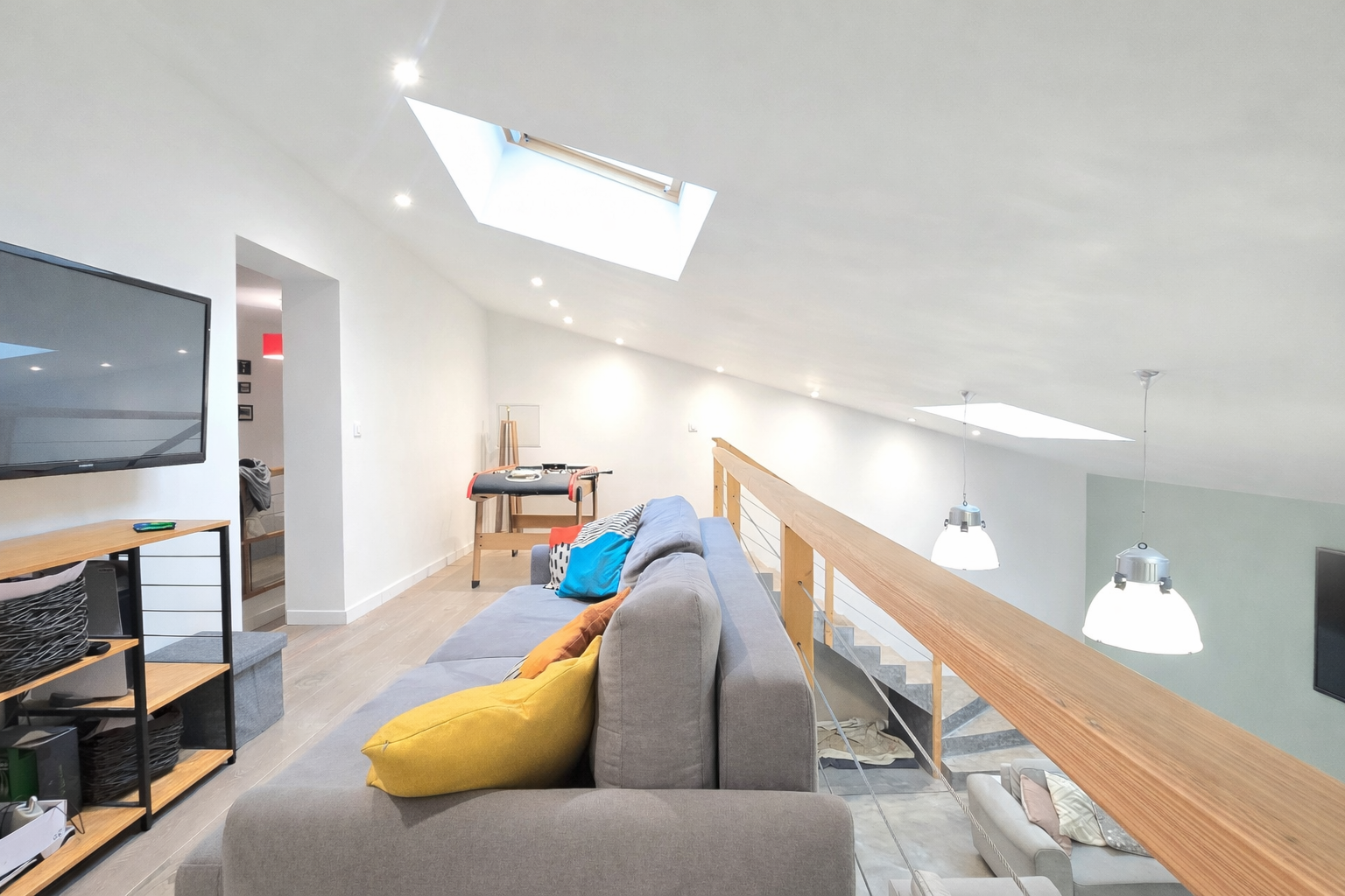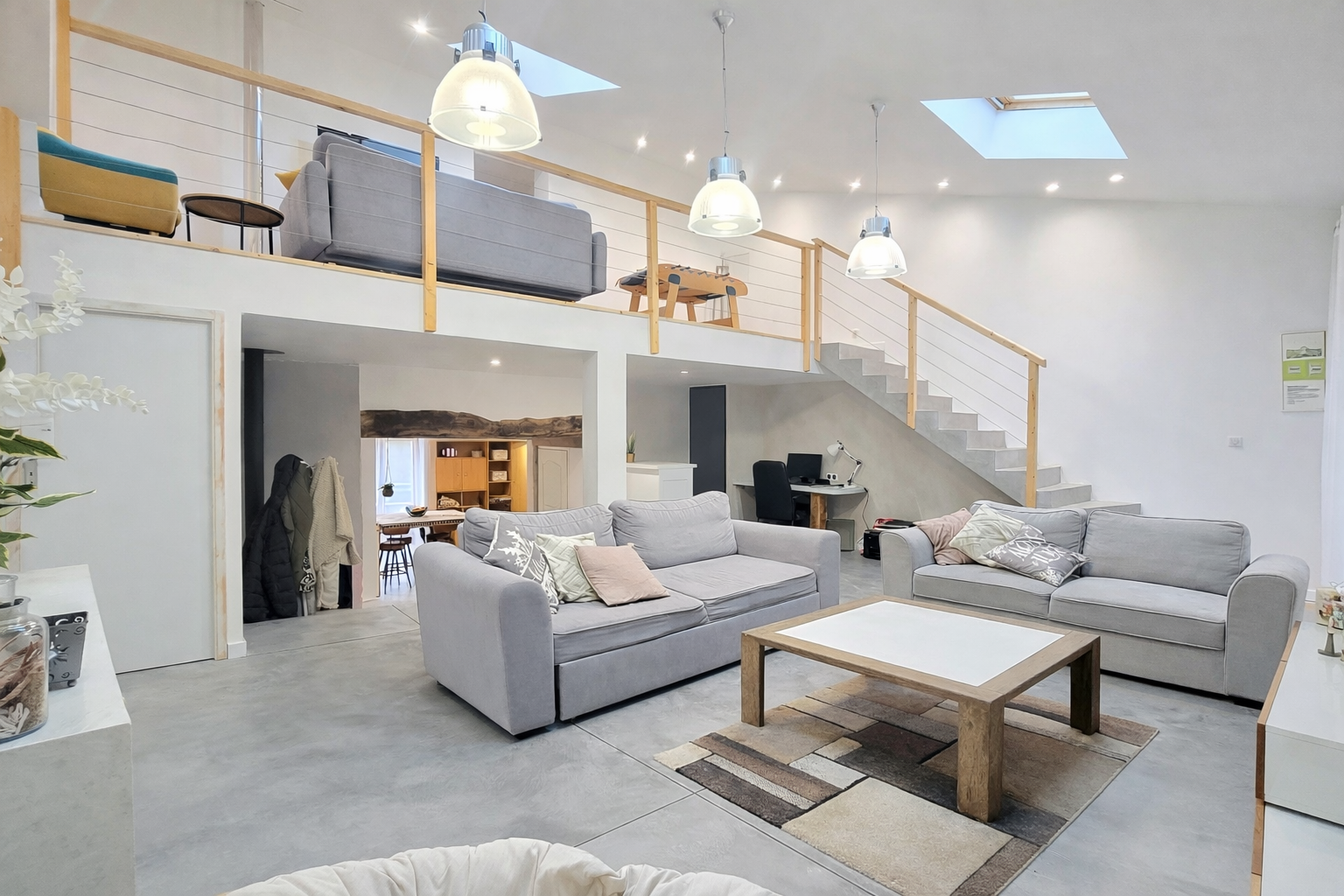 L’escalier situé côté salle à manger mène à l’espace nuit composé de trois chambres avec placards, dont une suite parentale avec salle d’eau privative. Une salle de bain indépendante ainsi qu’un WC complètent cet étage. Le palier communique avec une mezzanine surplombant la pièce de vie, parfaite pour un bureau, un espace détente ou une bibliothèque.