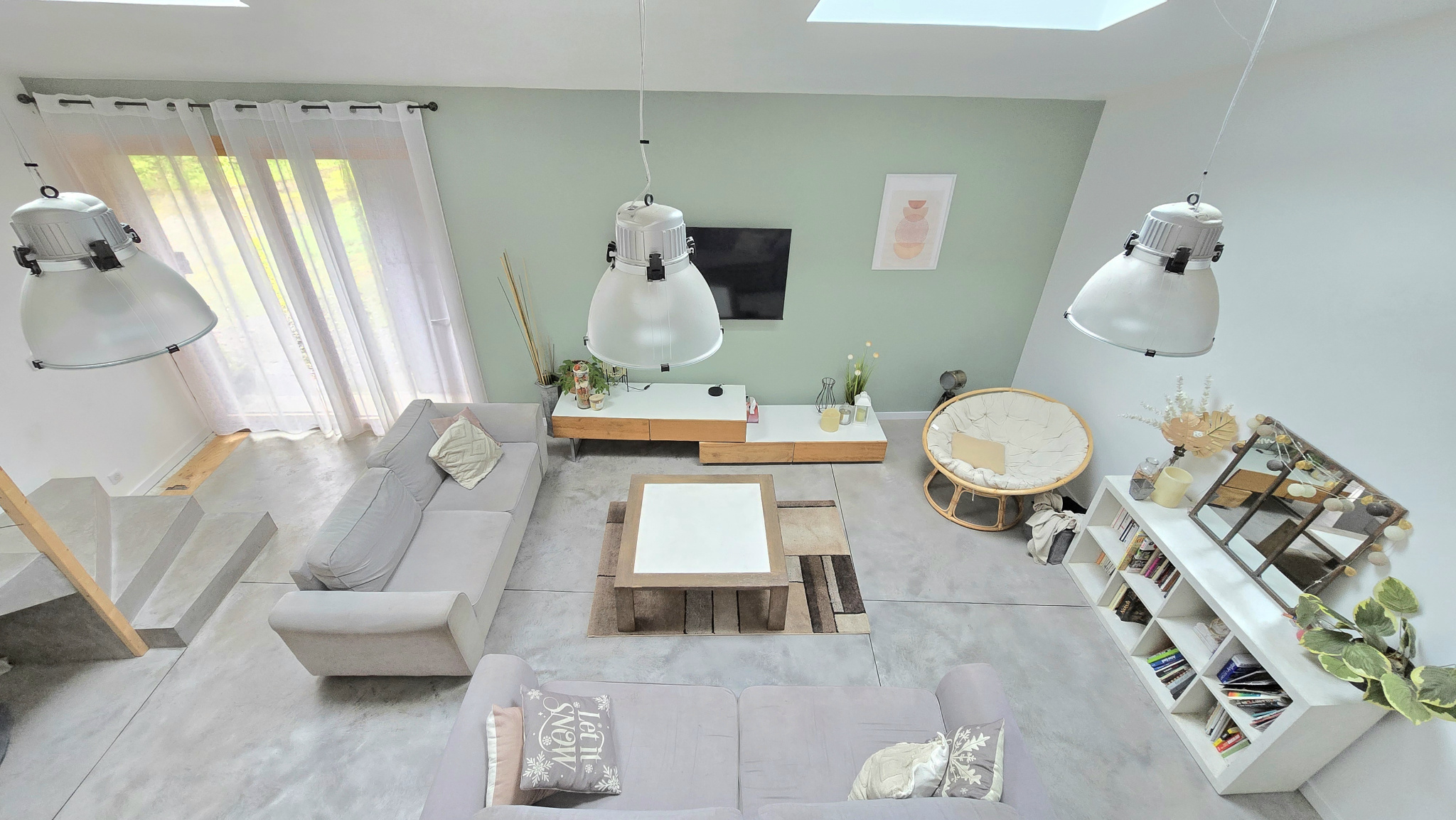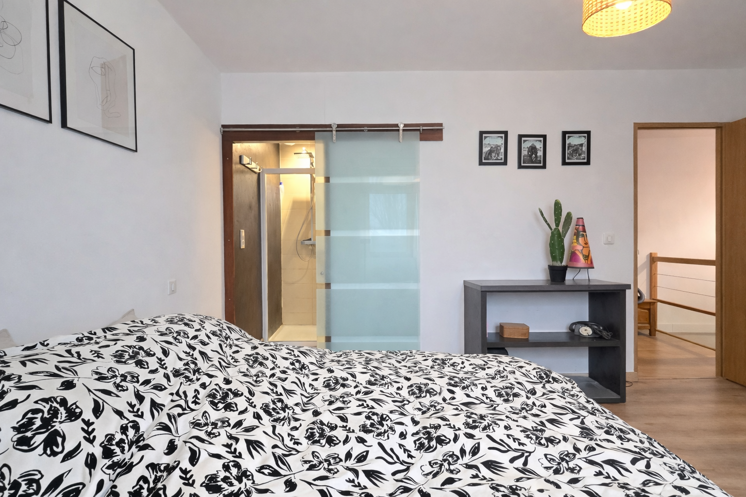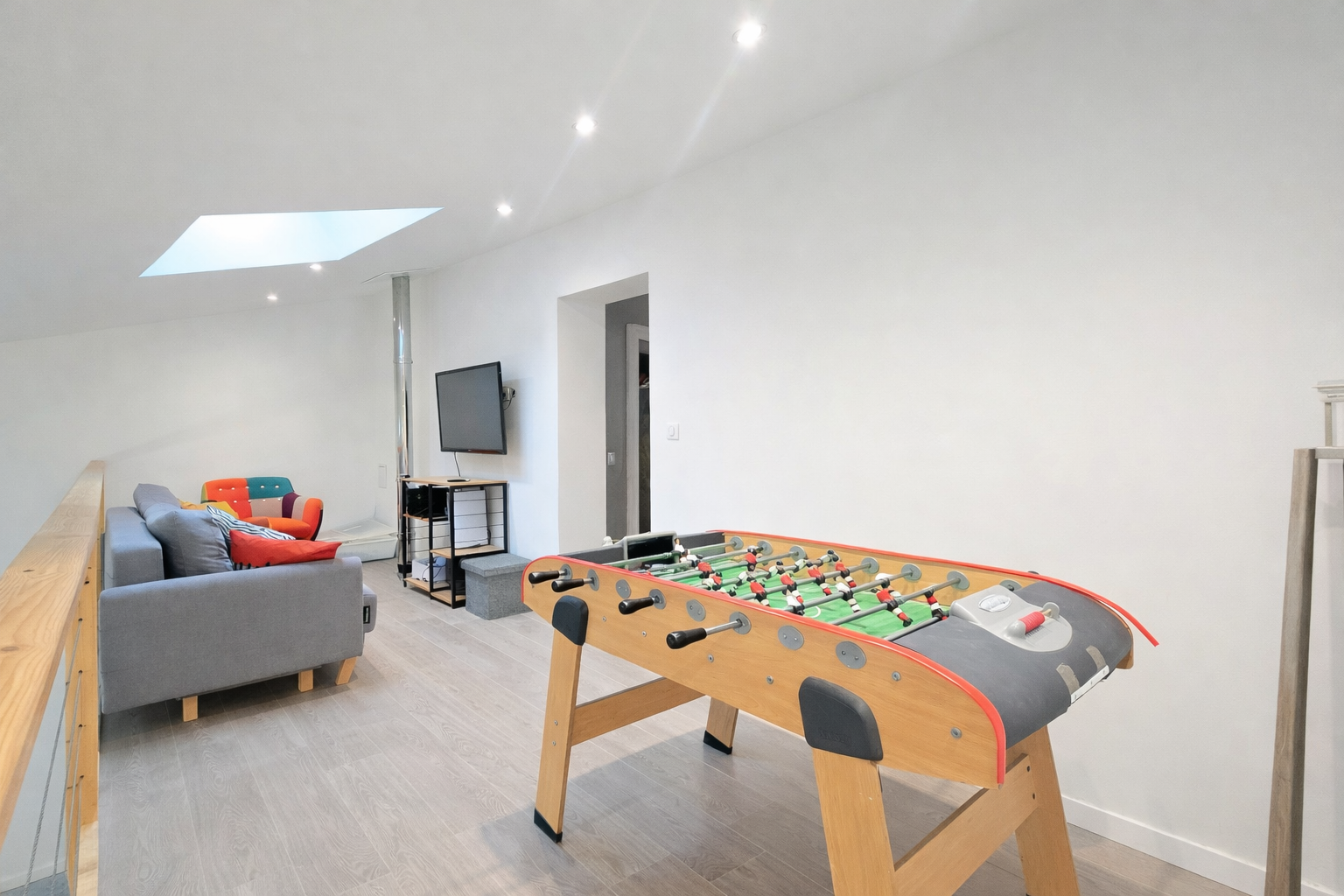 L’escalier situé côté salle à manger mène à l’espace nuit composé de trois chambres avec placards, dont une suite parentale avec salle d’eau privative. Une salle de bain indépendante ainsi qu’un WC complètent cet étage. Le palier communique avec une mezzanine surplombant la pièce de vie, parfaite pour un bureau, un espace détente ou une bibliothèque.