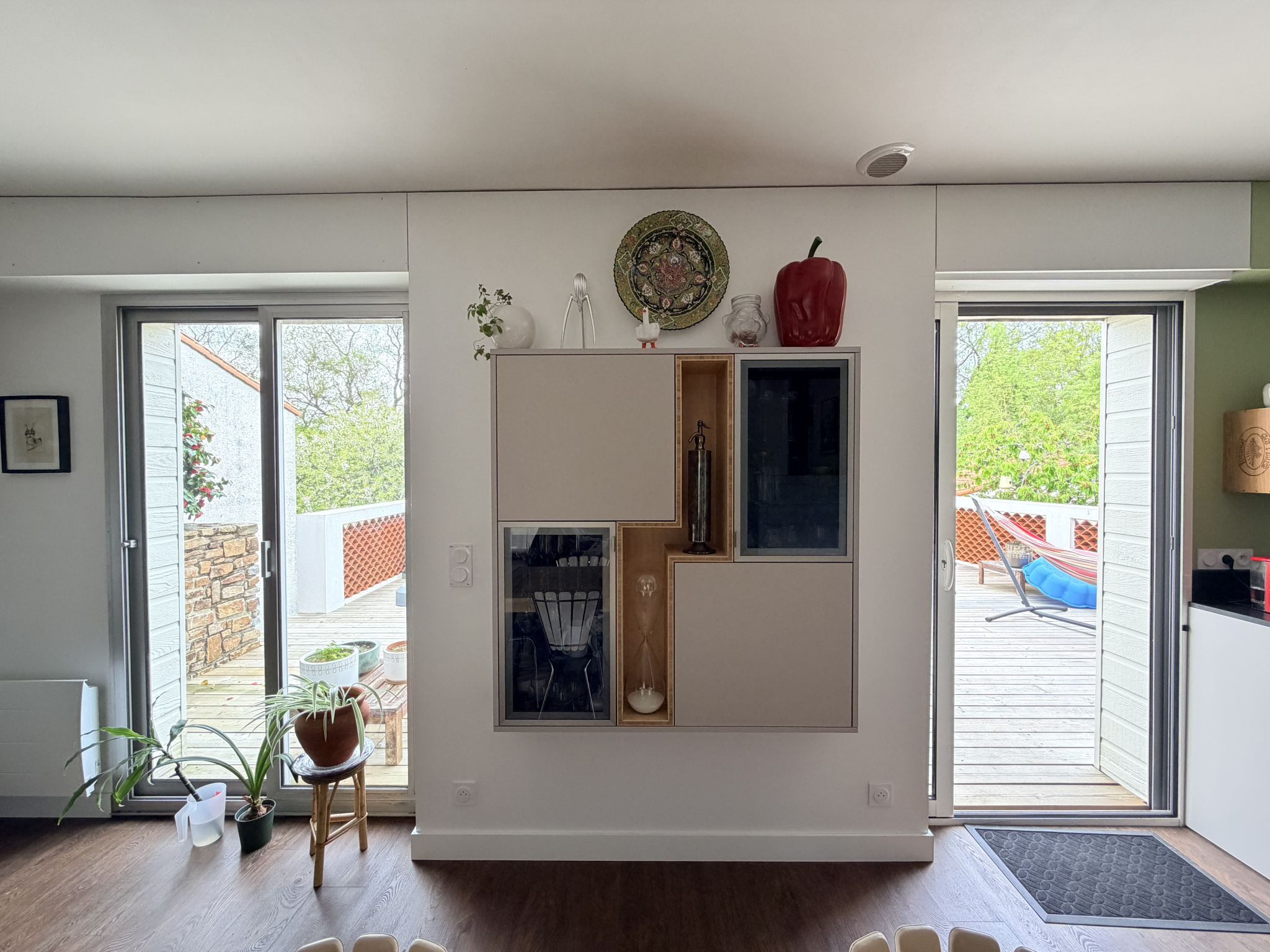 L’ensemble s’ouvre sur une grande terrasse d’environ 60 m2 avec vue dégagée sur la nature et de beaux chênes.