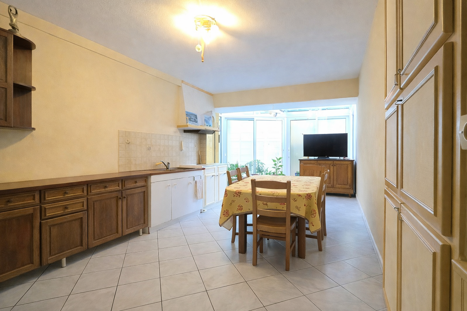 Au rez-de-chaussée, l’entrée s’ouvre sur une salle à manger/pièce de vie qui mène à une grande cuisine, offrant des volumes intéressants.