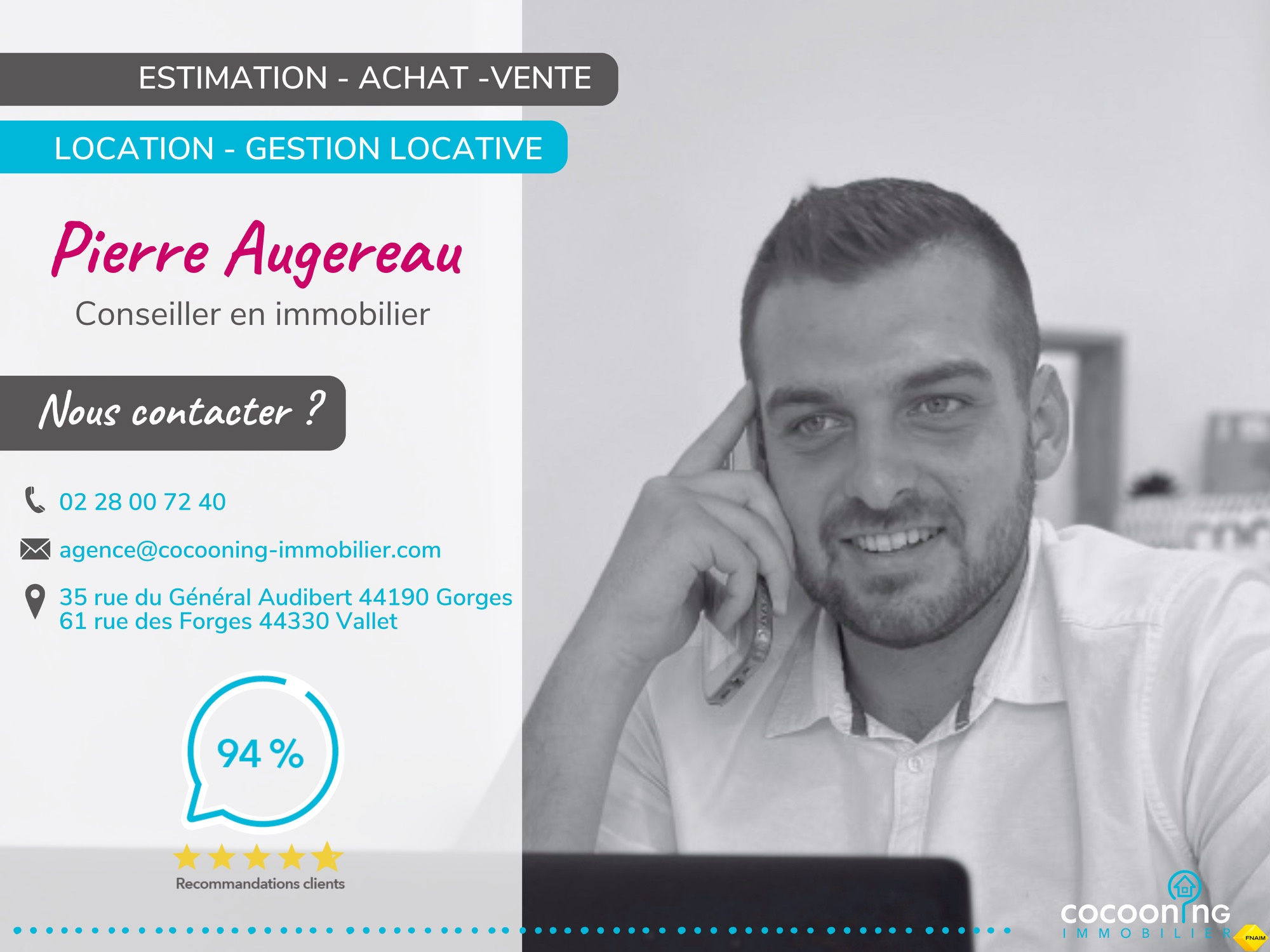 Pour visiter et vous accompagner dans votre projet, contactez Pierre Augereau au 02.28.00.72.40 ou par mail : agence@cocooning-immobilier.com. Vous pouvez également nous rendre visite dans nos agences de Vallet et Gorges.